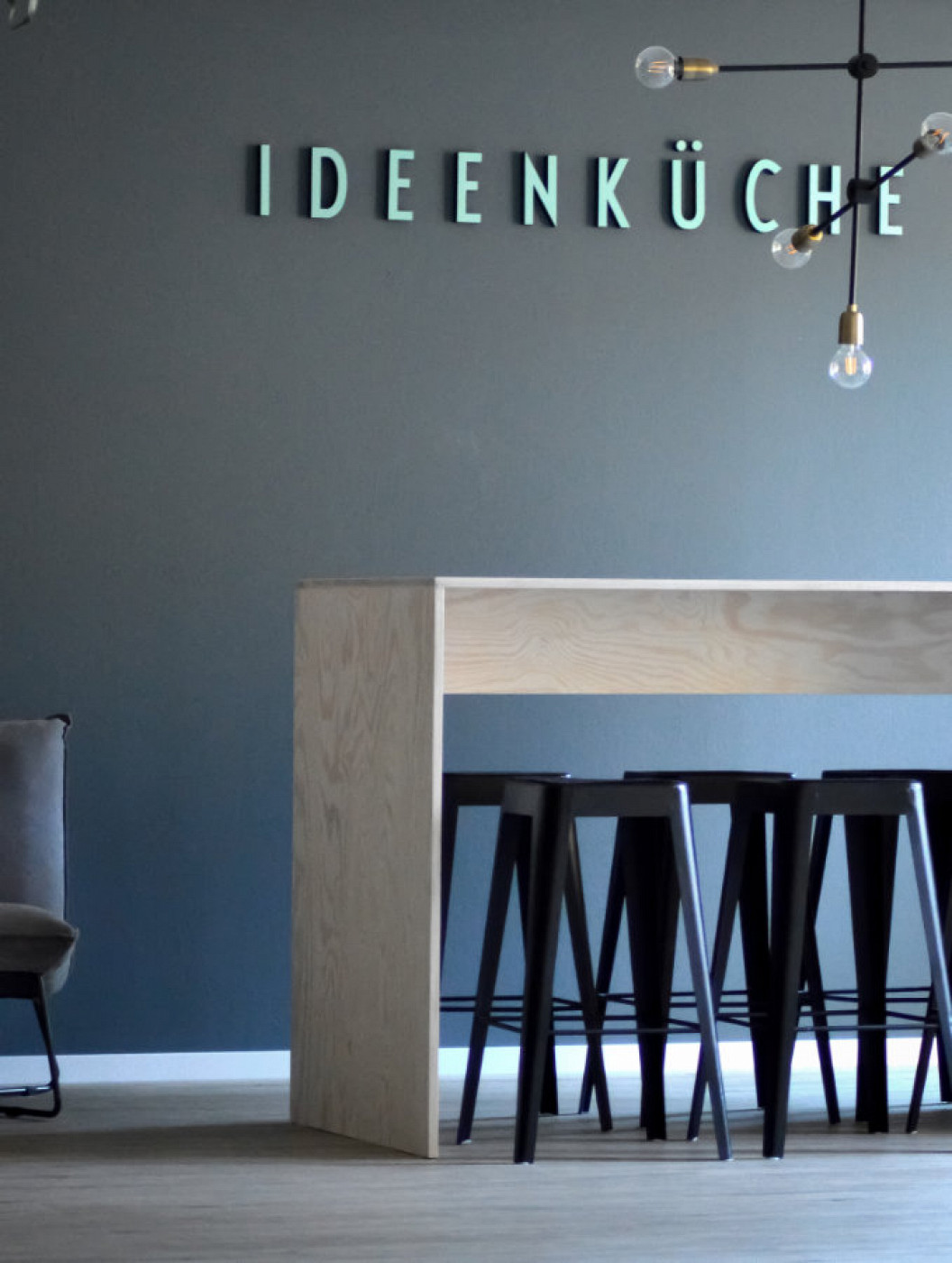 Eine Küche wird zum Coworking Space. Für das Kieler Software Unternehmen ppi Media GmbH verwandelten wir die triste Küchenecke in einen Ort der Kommunikation und Begegnung – die Ideenküche. Ein multifunktionaler Stehtisch steht im Mittelpunkt der Gestaltung und lädt zum kreativen Arbeiten und Ideenaustausch ein. Hier kochen die Ideen hoch! Eine Trennwand aus hellem Holz, versehen mit Grünpflanzen, sorgt zudem für eine Wohlfühlatmosphäre und mehr Grün am Arbeitsplatz.